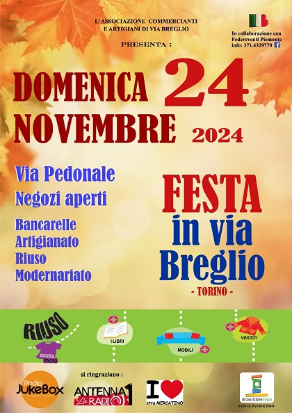 " Via Breglio in Bancarella "- Domenica 24 novembre 2024 ci sarą la festa di Via che interesserą via Breglio nel tratto compreso tra via Manunzio e via Casteldelfino escluse.