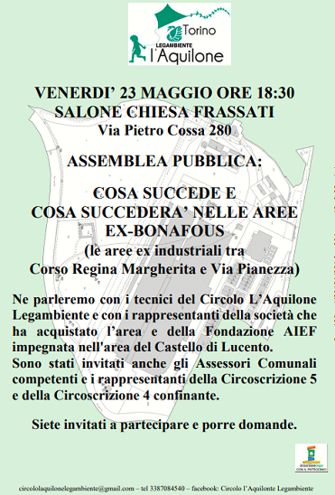 L'Assemblea Pubblica a cura dell'Associazione Circolo L'Aquilone Legambiente si terrà il giorno venerdì 23 maggio2025 alle ore 18:30 presso il Salone della Chiesa Frassati in via Pietro Cossa n. 280 -Torino-