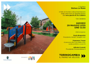 Si comunica che giovedì 29 maggio 2025 alle ore 12:00 è prevista l'inaugurazione dell'area giochi dei Giardini di via Calabria a Torino, riqualificata a seguito dei lavori del Piano TorinoCambia