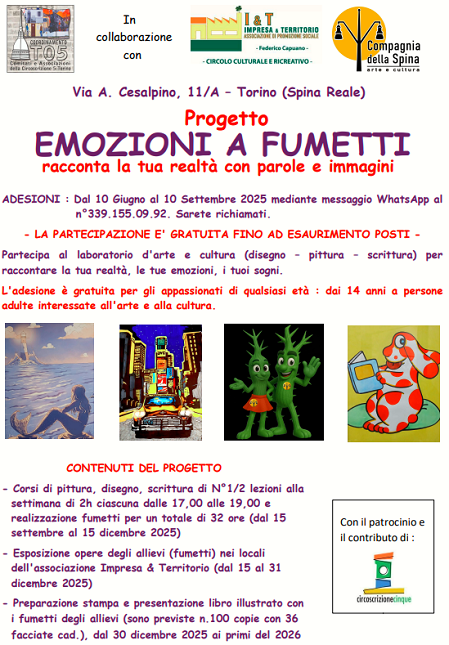 Il Coordinamento TO5, organizza corsi di fumetto con tecniche tradizionali e digitali, unitamente ai di corsi di scrittura, esposizione finale delle opere (fumetti con disegni e testi), preparazione e stampa del libro illustrato con le opere a fumetti. Adesioni: dal 10 giugno 2025 al 10 settembre 2025.