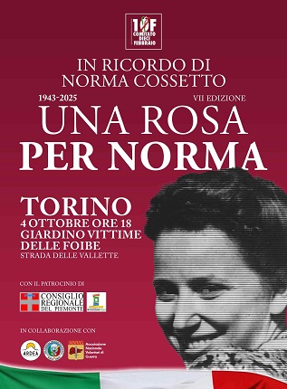 Il Comitato 10 Febbraio informa che sabato 4 ottobre 2025, alle ore 18 presso il Giardino Vittime delle Foibe a Torino, si svolgerā l'iniziativa di carattere nazionale "Una Rosa per Norma Cossetto".