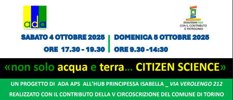 Il prossimo 4 ottobre e 5 ottobre 2025, presso il Teatro Principessa Isabella in via Verolengo 210-Torino- si terranno due manifestazioni previste per il progetto "Non solo acqua e terra ...Citizen Science" ideato da ADA Associazione per la Didattica e l'Ambiente APS, con il contributo e patrocinio della Circoscrizione 5° della città di Torino.
