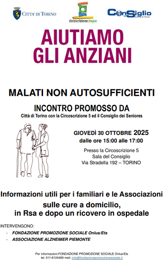Incontro promosso da Città di Torino con la Circoscrizione 5 ed il Consiglio dei Seniores. Giovedì 30 ottobre 2025 dalle ore 15:00 alle ore 17:00 presso la Sala Consiglio della Circoscrizione 5 sita al 2° piano del Centro Civico di via Stradella 192 -Torino-