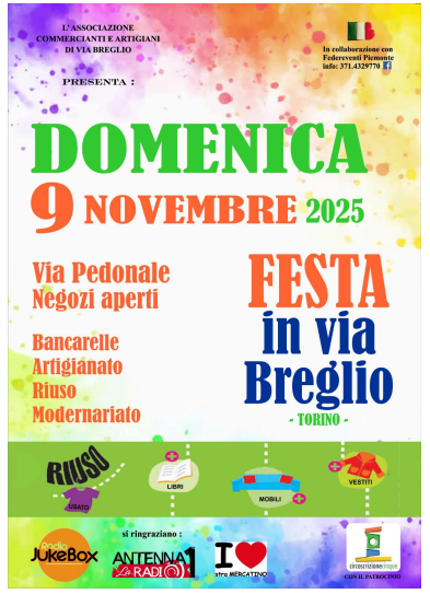 Domenica 09 novembre 2025 si svolgerā la Festa di Via denominata "Via Breglio in Bancarella", organizzata dall'Associazione commercianti e Artigiani di via Breglio che interesserā via Breglio nel tratto compreso fra via Manunzio e via Casteldelfino escluse. E' prevista la chiusura al traffico veicolare dalle ore 6:30 alle ore 23:30.