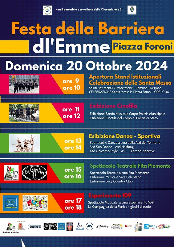 Domenica 20 ottobre 2024 sarā di nuovo festa grande in Barriera di Milano. Curata da Carosello Eventi con il Patrocinio di Circoscrizione 6 e Cittā di Torino, č in programma una giornata ricca di appuntamenti e significato dedicata alle associazioni del territorio: la Santa Messa, l'esibizione della banda musicale del Corpo di Polizia Municipale e del reparto cinofilo della Polizia di Stato, spettacoli ed esibizioni teatrali e di danza. Appuntamento in Piazza Foroni dalle h 9 alle 18.