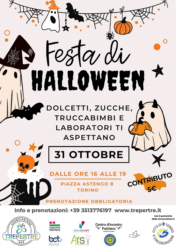 Il 31 ottobre 2024 dalle ore 16 alle 19, in Piazza Astengo 8 si terrà una festa di Halloween per i più piccoli, con dolcetti, zucche, truccabimbi e divertenti laboratori creativi. L'evento è organizzato dall'Associazione Trepertre APS con il patrocinio della Circoscrizione 6.