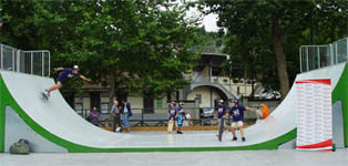 Così, subito dopo i saluti e gli auguri istituzionali, gli atleti della società sportiva "All Riding" e i ragazzi dei centri estivi del quartiere hanno testato la nuova piastra, grande complessivamente 20×40 mt., "scivolando" sulla doppia rampa grande (media pipe - 12×6 mt.), la rampa piatta piccola (bank - 4×4 mt.), la rampa a tronco di cono (fun box - 6×6 mt.) e la rampa concava piccola (quarter - 4×3,5 mt.). Anche il fondo della pista è stato curato. Infatti, le marmette di graniglia sono state levigate per favorire uno scivolamento fluido delle tavole; e ancora, le sponde in legno della balaustra che delimitano lo spazio attrezzato sono state riparate e verniciate, inoltre è stato creato un cordolo di rinforzo per garantire la massima sicurezza.