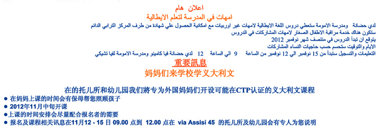 * Información y inscripción en las escuelas de via Camino 8 y de via Cecchi 2 desde el 12 noviembre hasta el 15 noviembre 2012 horario 9.00 - 12.00