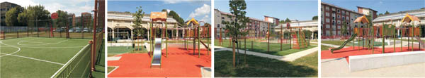 L'area si compone di un campo polivalente (calcetto, basket, pallavolo e tennis) attrezzata con strutture in acciaio colorato, robuste e innovative. Giochi per i bambini, in diverse fasce d'etā, dalla classica altalena con le molle, al castello colorato e divertente con gli scivoli e le pareti da scalare, anche questi in robusto acciaio e pannelli in laminato colorato ad alta resistenza. Vialetti pedonali in mattonelle colorate, con robuste panchine in cemento, circondate dal prato e da 50 nuovi alberi di diverse specie. Un'area verde attesa dal quartiere e dai suoi abitanti, un luogo dove incontrarsi e giocare, riposarsi e chiacchierare, un nuovo luogo d'incontro per i nuovi e i vecchi abitanti. La riqualificazione č stata realizzata con gli oneri a scomputo, dovuti dall'ATC alla Cittā per un importo complessivo di Euro 393.839.