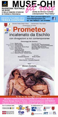 "Prometeo incatenato" è uno dei più importanti testi della drammaturgia classica. Eschilo ci ha consegnato un capolavoro che, squarciando la mole degli anni, arriva, possente, fino ai giorni nostri. Ci parla di un dio ribelle e caparbio, punito per aver amato troppo gli esseri umani cui ha donato, oltre alla vita, il fuoco e le più importanti invenzioni: il calcolo, la scrittura, l'agricoltura, l'architettura, la scienza medica. Ai nostri occhi Prometeo appare come l'emblema dell'intellettuale condannato a restare incatenato alla propria condizione, costretto dolorosamente a riflettere in eterno su cosa voglia dire non assoggettare la propria onestà intellettuale al volere di uno spietato tiranno. Al suo fianco si schiera il Coro delle Oceanine, giovani ninfe che, sposandone la causa, cadono a loro volta sotto i colpi del crudele Signore dell'Olimpo. Il nostro allestimento, concepito per sfruttare al meglio la straordinaria ambientazione offerta dalla stazione GTT Ferrovie di Borgo Dora, si rivolge in particolar modo ai giovani, spronandoli a non abdicare mai e a difendere il valore universale della cultura.