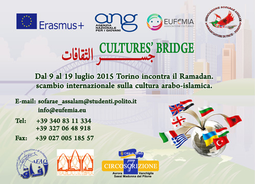Dal 9 al 19 Luglio 2015 Torino ospiterà lo scambio internazionale "Culture Bridge - GISR ATAKAFAT", che vedrà coinvolti 70 ragazzi dai 18 ai 26 anni provenienti da 10 Paesi diversi (Italia, Ungheria, Bulgaria, Albania, Inghilterra, Ucraina, Grecia, Egitto, Georgia, Turchia).