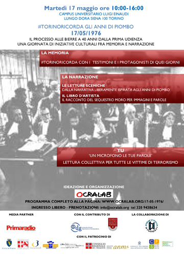 Il Campus Einaudi ospita una giornata di eventi culturali per ricordare gli Anni di Piombo, a 40 anni esatti dalla prima udienza del processo alle Bierre. Organizza Ocra Lab Idee per comunicare.