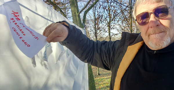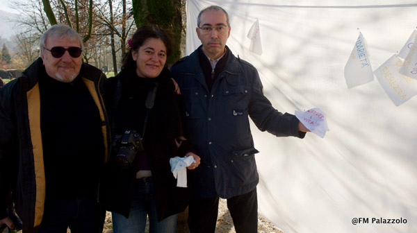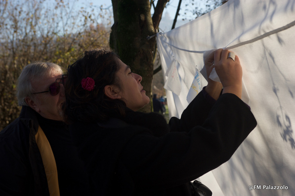 A causa delle eccezionali precipitazioni delle ultime settimane, il Flash Mob previsto per la giornata internazionale contro la violenza sulle donne di venerdì scorso è stato rimandato a data da definire in primavera. Ma le donne e gli uomini di Tékhné hanno comunque voluto trasmettere un messaggio di non violenza di ogni genere dando vita all'istallazione pubblica Tra Terra e Cielo, che ha inaugurato il primo evento del progetto. Domenica 27 dalle 11,00 del mattino, nella suggestiva location del Parco del Meisino, rientrata la piena dei fiumi, un abbraccio di vestiti lungo 70 metri ha simbolicamente denunciato la violenza contro i più deboli: donne, uomini, bambini o la natura stessa che spesso deturpiamo. I passanti sono stati inoltre invitati a scrivere un messaggio di pace e non violenza su un telo bianco, invito accolto anche dal Presidente della Circoscrizione 7 Luca Deri e dal Coordinatore del Forum "Nuovi cittadini - Pari Opportunità" Gianfranco Azeglio.
