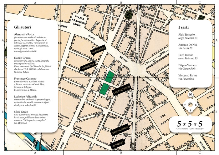 Da ogni sarto troverà un racconto, uno solo dei cinque, una copertina che racconta l'iniziativa e che contiene la stessa mappa vista on-line che gli permetterà di continuare il giro e di raccogliere gli altri racconti. Seguendo la cartina il pubblico potrà raccogliere gli altri racconti, conoscere gli altri sarti, visitare il quartiere e tornare a casa con un piccolo libro di racconti.