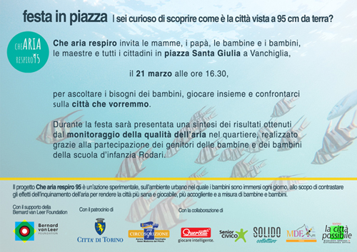 L'obiettivo del progetto Urban95 'Azioni contro l'inquinamento atmosferico per una città sana e giocabile' è duplice : a) sperimentare e valutare un approccio finalizzato a ridurre i danni dell'inquinamento sui bambini al di sotto dei 95 cm di altezza, ossia compresi nella fascia di età 0-5., b) sperimentare il principio del 'diritto alla città' attraverso un uso più democratico e sostenibile degli spazi pubblici esterni.