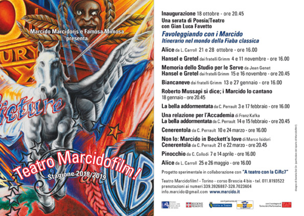 Il 2019 si aprirà con una serata speciale dedicata alla Poesia con l'intervento del poeta Roberto Mussapi; i sei doppi appuntamenti serali della stagione offrono proposte spettacolari assai diverse, filosoficamente antitetiche; nella prima parte di ciascuna delle serate saranno presentati tre spettacoli del nostro repertorio: "Una relazione per l'Accademia" di Kafka (2017),"Non Io: Marcido in Beckett's love" da Beckett (2012) e "Memoria dello Studio per le Serve" da Jean Genet (1984-spettacolo d'esordio dei Marcido); rappresentazioni a cui, nella seconda parte della rispettiva serata, abbiamo voluto accostare a specchio, le fiabe: "Hansel e Gretel", "La bella addormentata" e "Cenerentola", per onorare completamente quella "Tradizione" che amiamo tanto adottare quanto abbandonare, tradizione la quale allegramente compita: "...seguirà una brillantissima Farsa"