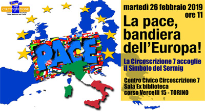 La Circoscrizione 7 del Comune di Torino è il primo ente pubblico a scegliere di adottare la Bandiera della Pace del Ser.Mi.G., che verrà issata martedì 26 febbraio nel giardino della sede del Centro Civico di corso Vercelli 15. La bandiera rimanda alla fine della Grande Guerra, avvenuta cento anni fa; fu a partire da quel momento che si iniziò a discutere circa la possibilità di costituire un'entità continentale garante della Pace, progetto che si sarebbe concretizzato dopo la tragedia della Seconda Guerra Mondiale portando alla nascita dell'attuale Unione Europea. La giornata di martedì 26 febbraio sarà dunque occasione di festa e di riflessione, con l'intervento di storici, rappresentanti delle istituzioni e giornalisti.