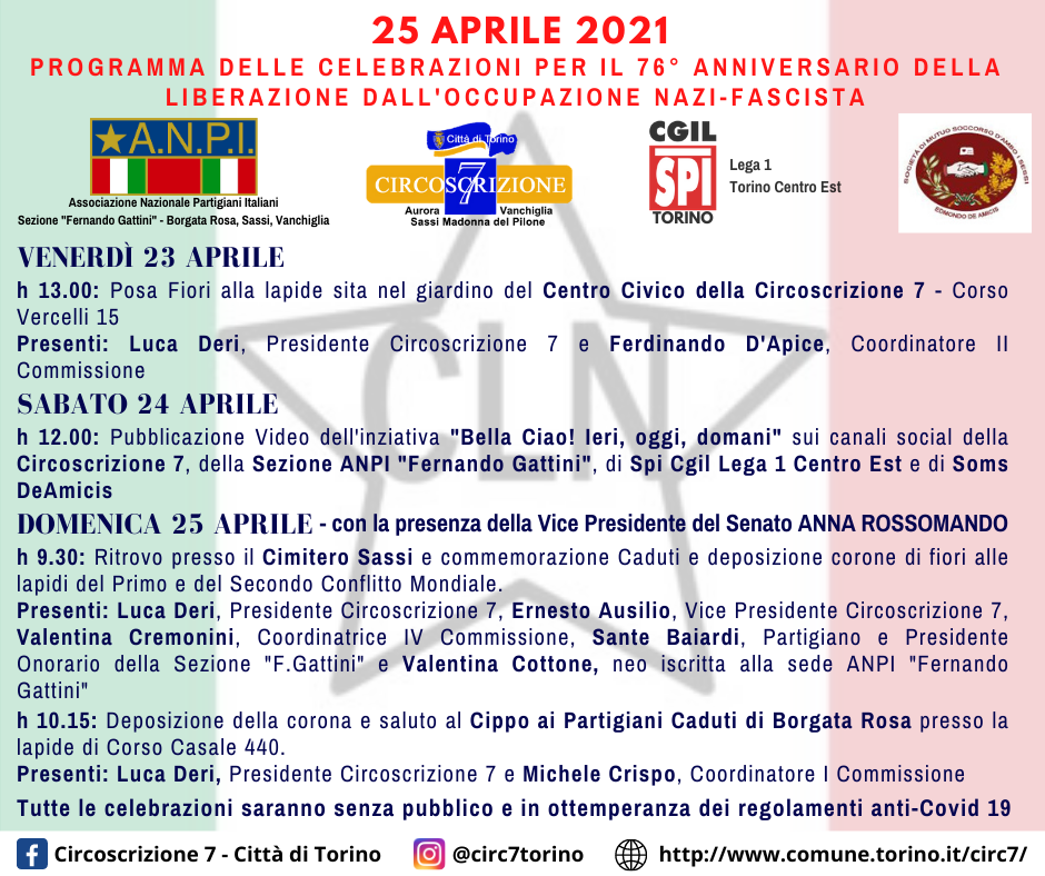 In occasione del 76° anniversario, la Circoscrizione 7 è lieta di presentare il programma delle celebrazioni, reso possibile grazie alla collaborazione della Sezione ANPI "Fernando Gattini", della Spi Cgil Lega 1 Centro Est e di Soms DeAmicis Torino.