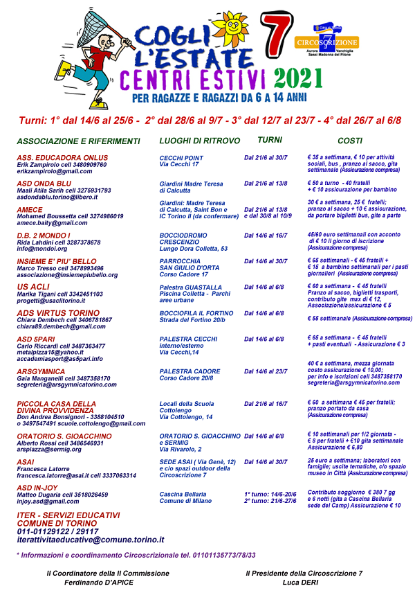 Il cartellone "Cogli l'Estate" della Circoscrizione 7 torna a proporre una ricca gamma di opportunità per ragazze e ragazzi della fascia di età compresa tra i 6 e i 14 anni.