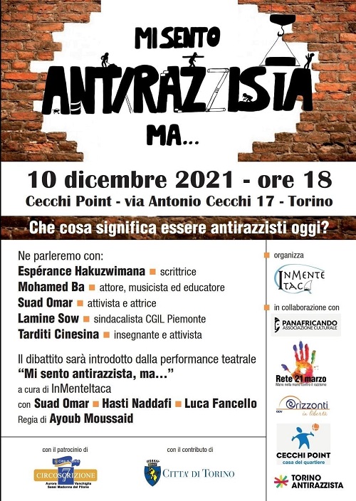" Mi sento Antirazzista, ma..." è un evento organizzato da InMenteItaca, Rete 21 Marzo - Mano nella Mano contro il razzismo, Associazione Panafricando e Associazione Orizzonti in Libertà, con il contributo della Città di Torino e il patrocinio della 7° Circoscrizione.