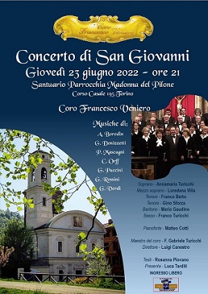 Giovedì 23 giugno 2022 ore 21,00 presso il Santuario Parrocchia Madonna del Pilone in Corso Casale n.195.Con il Patrocinio della Circoscrizione 7.