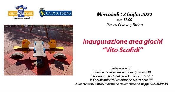 Prosegue l'opera di riqualificazione delle aree gioco della Circoscrizione 7. Mercoledi' 13 luglio alle ore 17.00 verrą riaperta l'area giochi Vito Scafidi in piazza Chiaves in cui sono stati sostituiti i giochi con nuove attrezzature pił funzionali e moderne