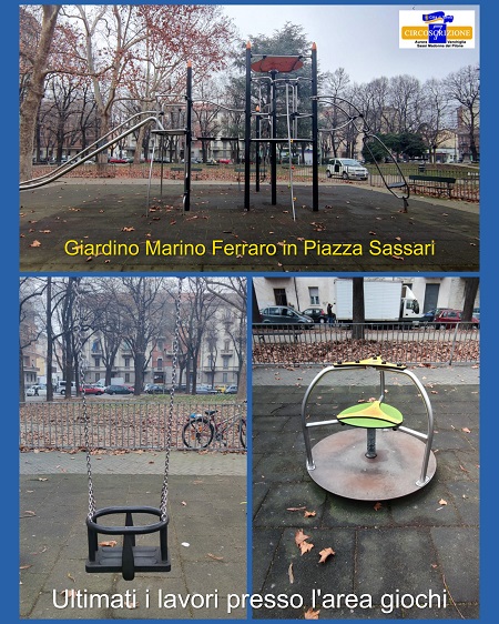 Ultimati i lavori presso l'area giochi dei giardini Marino Ferraro in cui sono stati sostituiti i tappi della bulloneria della struttura principale e dello scivolo, un perno di rotazione, le catene di sicurezza e i seggiolini dell'altalena, per un costo di 3500 euro.