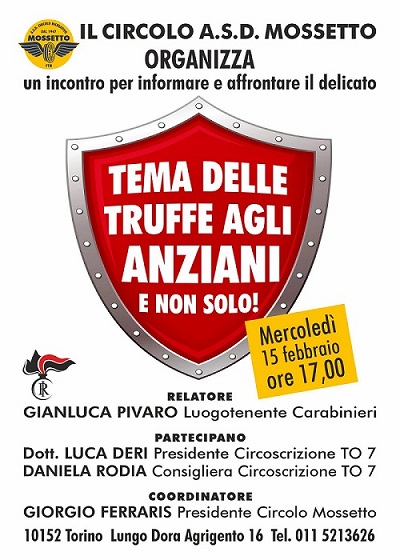 Il Circolo ASD Mossetto organizza un incontro per informare e affrontare il tema delle truffe agli anziani.Mercoledì 15 febbraio 2023 alle ore 17,00 in Lungo Dora Agrigento n.16.