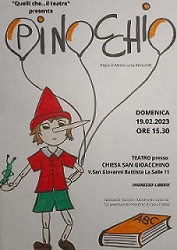 Domenica 19 febbraio 2023 alle ore 15,30 presso il teatro della Parrocchia di San Gioacchino, in Corso Giulio Cesare 10 bis, la Compagnia "Quelli che...il teatro" metterā in scena lo spettacolo teatrale "Pinocchio", liberamente tratto da "Le avventure di Pinocchio" di Carlo Collodi.