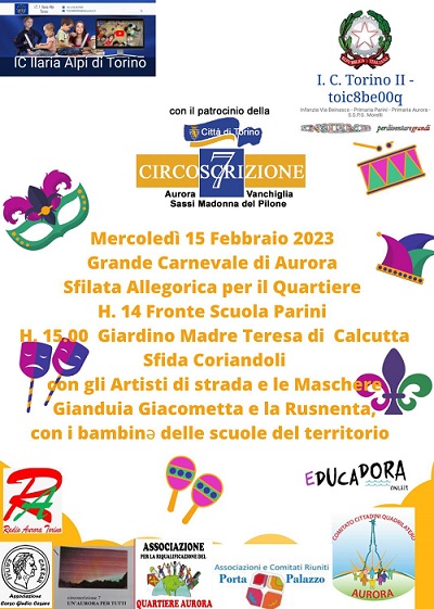 invitano tutti alla sfilata allegorica che si terrà mercoledì 15 febbraio 2023 nel quartiere Aurora,
