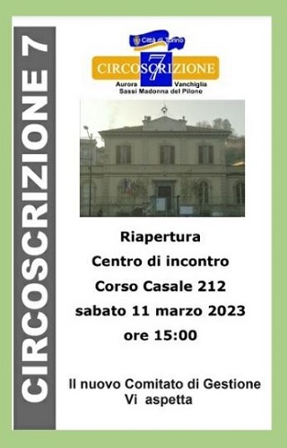 La Circoscrizione 7 annuncia la riapertura e il rilancio del Centro d'Incontro di corso Casale 212, che nell'accogliente palazzina nel cuore del quartiere Madonna del Pilone riprende sia l'apertura quotidiana che le attività culturali e di intrattenimento.