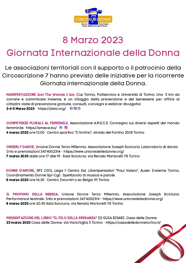 Le associazioni territoriali, con il supporto o il patrocinio della Circoscrizione 7, hanno previsto una serie di iniziative per la ricorrente "Giornata internazionale della Donna".