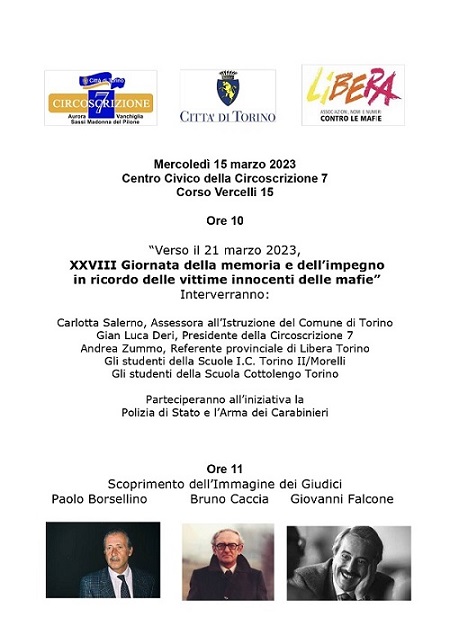 A seguito di un ordine del giorno intitolato "Il simbolo della legalità alla Sette", approvato lo scorso anno all'unanimità dal Consiglio della Circoscrizione 7, ha preso forma l'iniziativa "Verso il 21 marzo 2023, XXVIII Giornata della Memoria e dell'Impegno in ricordo delle Vittime innocenti delle mafie", in programma mercoledì 15 marzo alle ore 10 presso il salone situato al piano terra (ex biblioteca) della sede circoscrizionale di corso Vercelli 15.