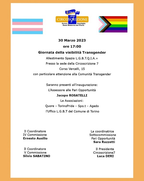 Giovedì 30 marzo 2023, alle ore 17,00, allestimento dello Spazio L.G.B.T.Q.I.A.+ presso la sede della Circoscrizione 7 in Corso Vercelli, 15.