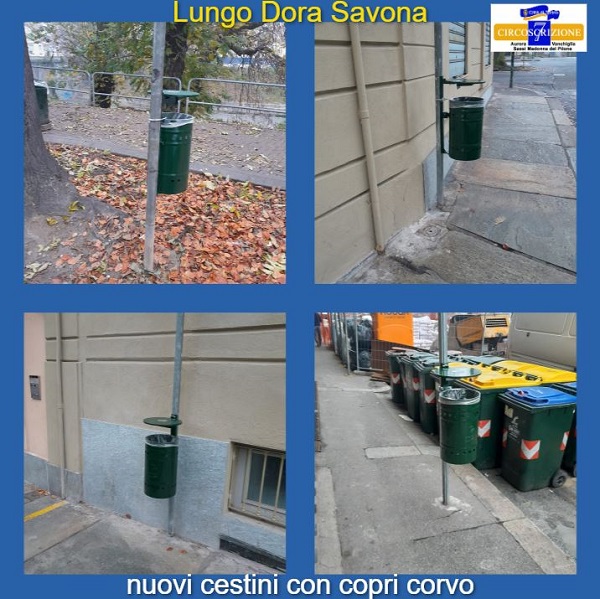 Sono stati collocati 4 cestini con copri corvo in Lungo Dora Savona.Con queste nuove collocazioni, la dotazione di cestini con copri corvo nel quartiere Aurora raggiunge il numero di oltre 200