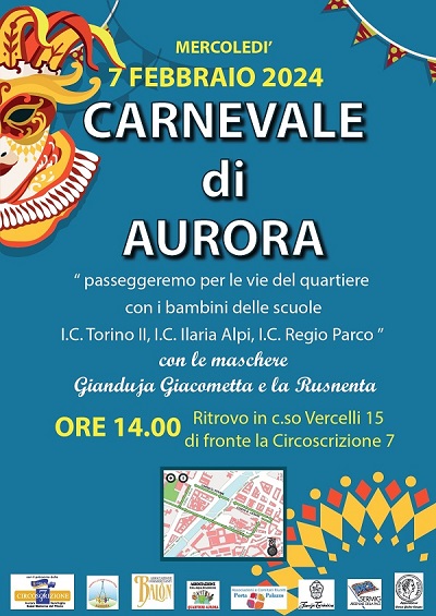 Mercoledì 7 febbraio si terrà l'edizione 2024 del Carnevale di Aurora, evento organizzato dal Comitato Cittadini Quadrilatero Aurora con altri Comitati e Associazioni attivi sul territorio.