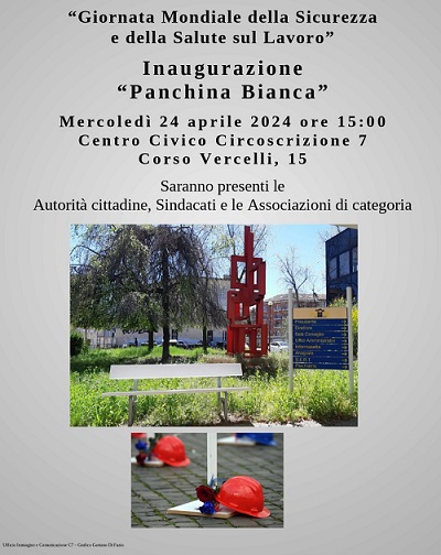 Mercoledì 24 aprile 2024, alle ore 15.00, si terrà presso il Centro Civico della Circoscrizione 7, in corso Vercelli 15, l'inaugurazione della "Panchina Bianca", in memoria dei caduti e a difesa del diritto alla Sicurezza sul Lavoro.