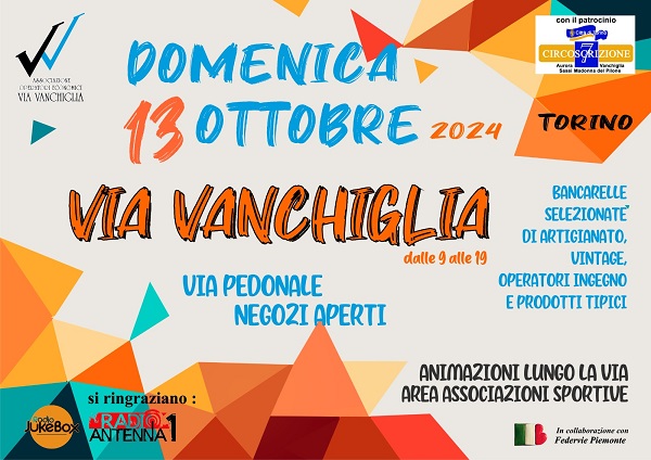 Domenica 13 ottobre 2024, dalle 09,00 alle 19,00, si terrą la Festa di via Vanchiglia: via pedonale, negozi aperti, bancarelle, animazione.Con il patrocinio della Circoscrizione 7.