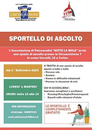 L'Associazione di Psicoanalisi "Sotto la Mole", dal 1 settembre 2024, ha avviato uno Sportello di Ascolto