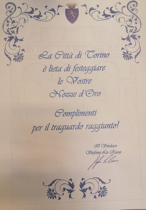 Sabato 10 maggio, presso il Centro Civico di corso Vercelli, si č tenuta la cerimonia di consegna delle pergamene per le Nozze d'Oro