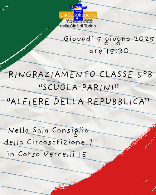 A nome del Presidente Gianluca Deri e della Circoscrizione 7, si ringrazia sentitamente la classe 5°B