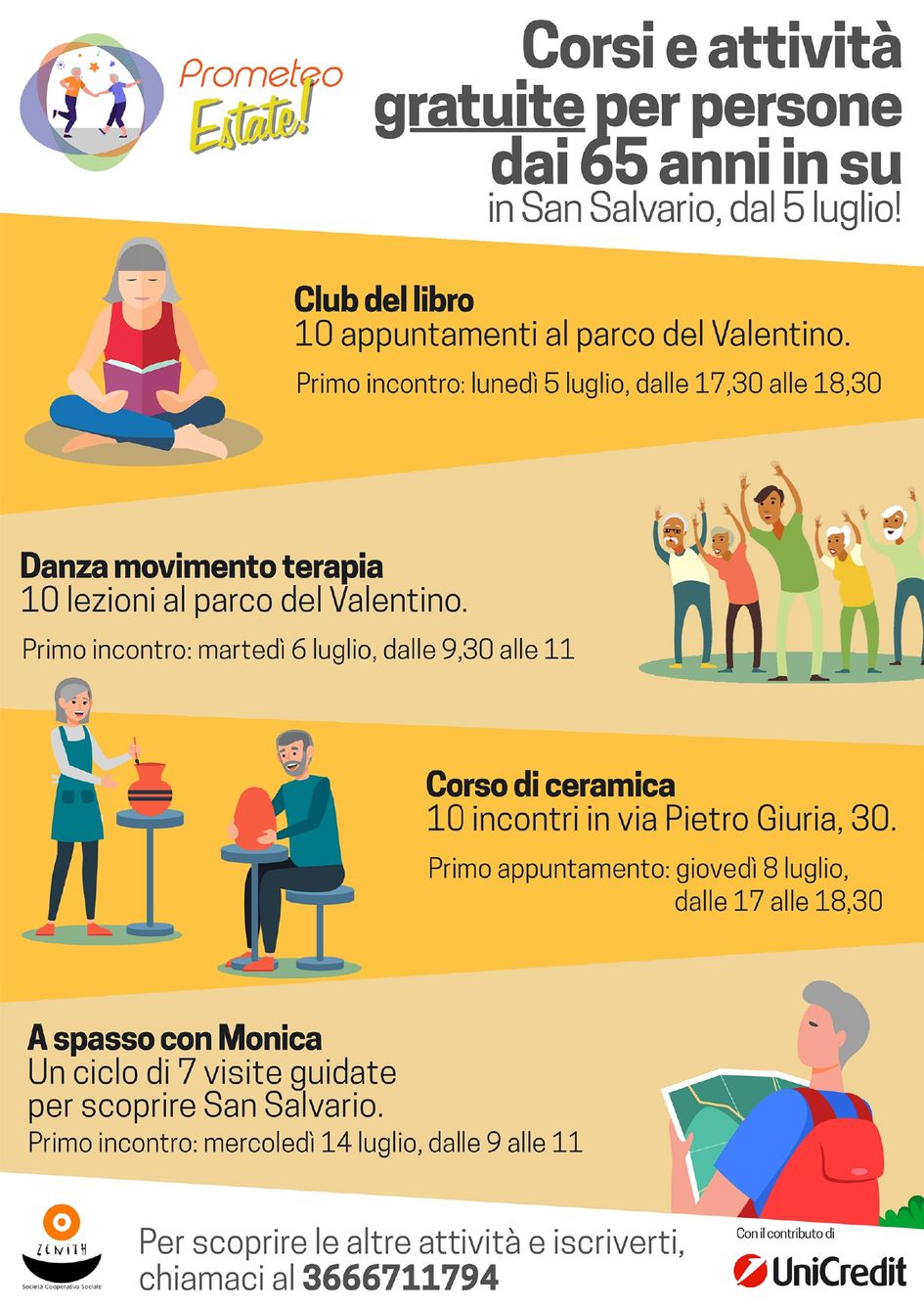 Corsi gratuiti per persone anziane nel quartiere San Salvario. Le attività, pensate in risposta all'emergenza caldo e al rischio di isolamento sociale, cominceranno lunedì 5 luglio e comprenderanno un club del libro, un corso di Danza movimento terapia, un laboratorio di ceramica, un gruppo di discussione, un ciclo di visite guidate del quartiere. I corsi sono svolti nel rispetto delle misure di sicurezza anti-covid.