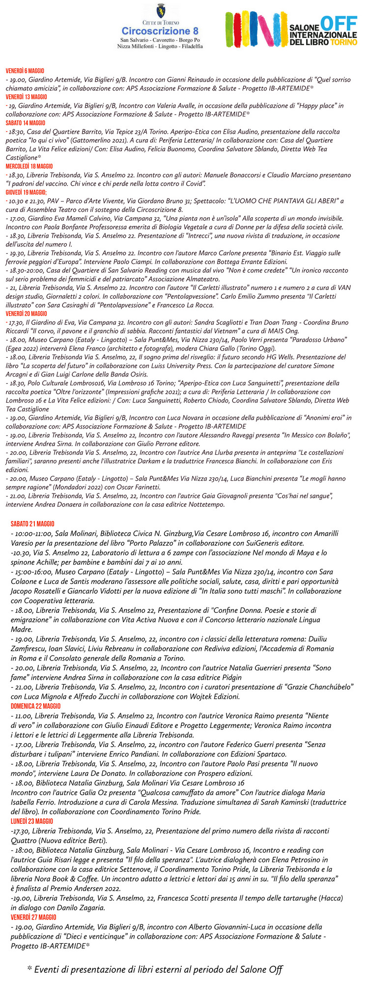 Il dialogo con il territorio, la coprogettazione sulla promozione del libro e della lettura e l'accoglienza delle proposte pił vivaci delle realtą istituzionali e culturali, anche di quelle meno conosciute, l'attenzione ai tanti spazi cittadini generatori di cultura, caratterizzano da sempre lo spirito del Salone Off, che nel corso dei suoi diciotto anni di vita ha saputo anticipare modalitą e tendenze, riprese poi da altri festival.