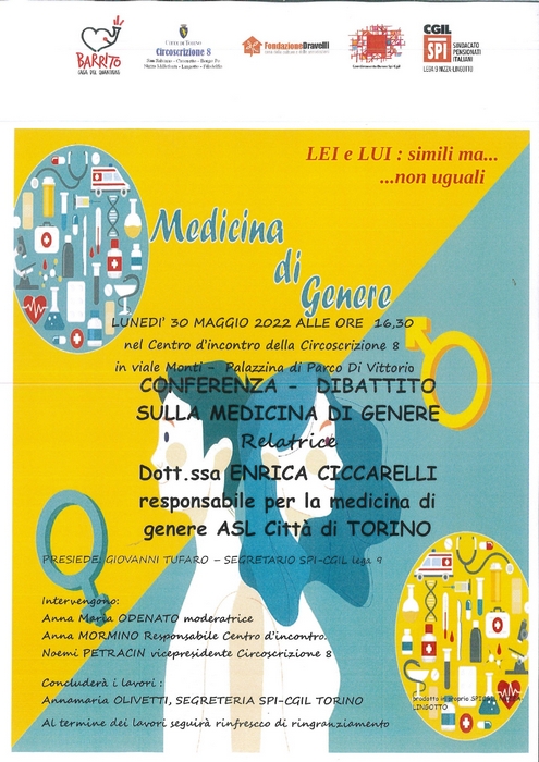 Incontro sulla medicina di genere lunedì 30 maggio ore 16.30 presso il Centro d'Incontro della Circoscrizione 8 - viale Monti - Palazzina di parco Di Vittorio