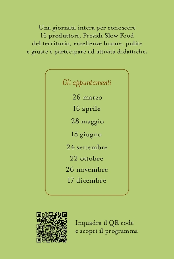Ecco il calendario completo del Mercato della Terra di Torino:- domenica 26 marzo- domenica 16 aprile- domenica 28 maggio- domenica 18 giugno- domenica 24 settembre- domenica 22 ottobre- domenica 26 novembre- domenica 17 dicembre.