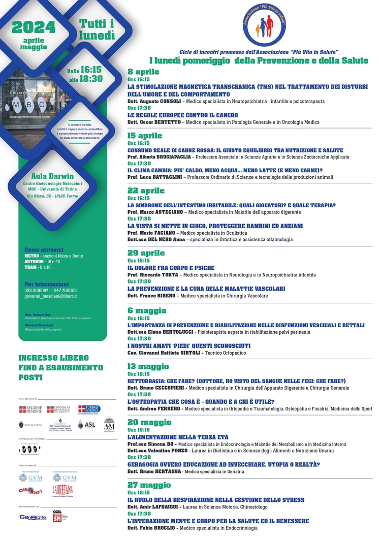 Lunedì 8 aprile 2024 riprenderanno gli Incontri - il 18° ciclo - sempre proposti dall' Associazione "Più Vita in Salute", finalizzati ad indicare l'adozione di corretti stili di vita fondamentali per 'prevenire' le malattie croniche oggi sempre più frequenti.