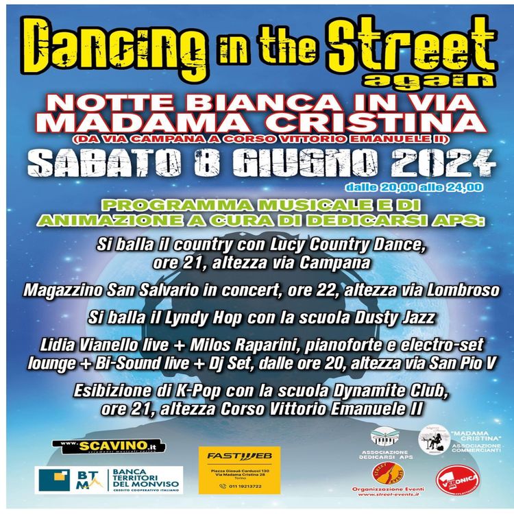 L'Associazione di Via Madama Cristina organizza l'evento serale denominato "Dancing in the street, 2° edizione — shopping, music, drink & food in via Madama Cristina" con il quale intende valorizzare una delle vie di Torino più rappresentative per il commercio. L'obiettivo è di potenziare l'attrattiva della via e valorizzare le eccellenze commerciali del territorio. Nello specifico, la notte bianca vuole essere un evento di richiamo basato su vari spettacoli musicali, di danza e intrattenimento, promuovendo lo shopping serale e lo street-food. Diversi scenari daranno vita alla festa con attrattive commerciali in spazi dedicati agli hobbisti, artigiani e promoter. Verranno coinvolte associazioni culturali, sportive e sociali, scuole del territorio, e saranno invitati musicisti e artisti di strada. I negozianti allestiranno le vetrine dei loro negozi a tema coinvolgendo la cittadinanza e proponendo shopping all'insegna della qualità. Saranno presenti, inoltre, un'esposizione di auto d'epoca, animazioni e giostre per bambine e bambini.