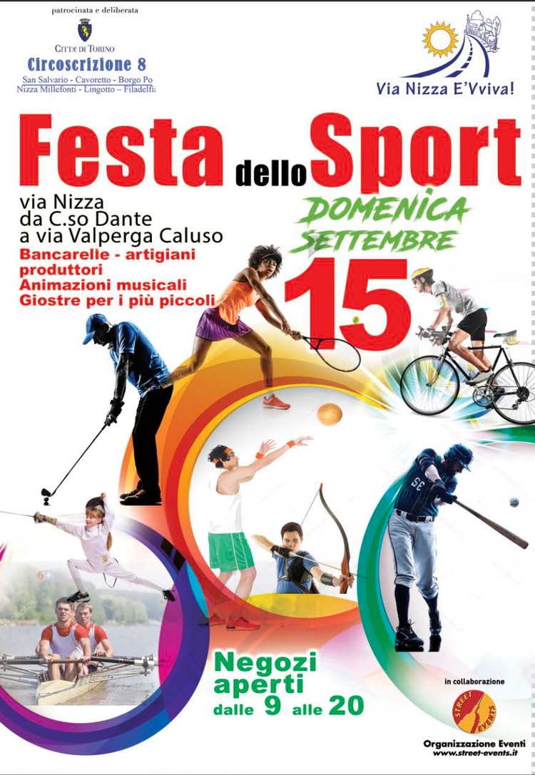 L'Associazione "Via Nizza E'Vviva" presenta, nella giornata di domenica 15 settembre, la Festa dello Sport. L'evento si terrà in via Nizza, da C.so Dante a via Valperga Caluso, con i negozi di prossimità aperti dalle 9:00 alle 18:00.