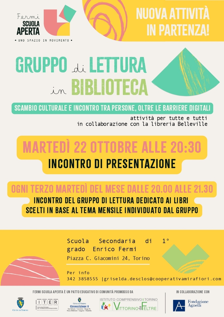 L'incontro di presentazione avrà luogo martedì 22 ottobre alle ore 20:30 in collaborazione con la libreria Belleville, mentre gli eventi proseguiranno ogni terzo martedì del mese, dalle 20:00 alle 21:30, presso la Scuola Secondaria di 1° Grado Enrico Fermi, situata in Piazza C. Giacomini 24.