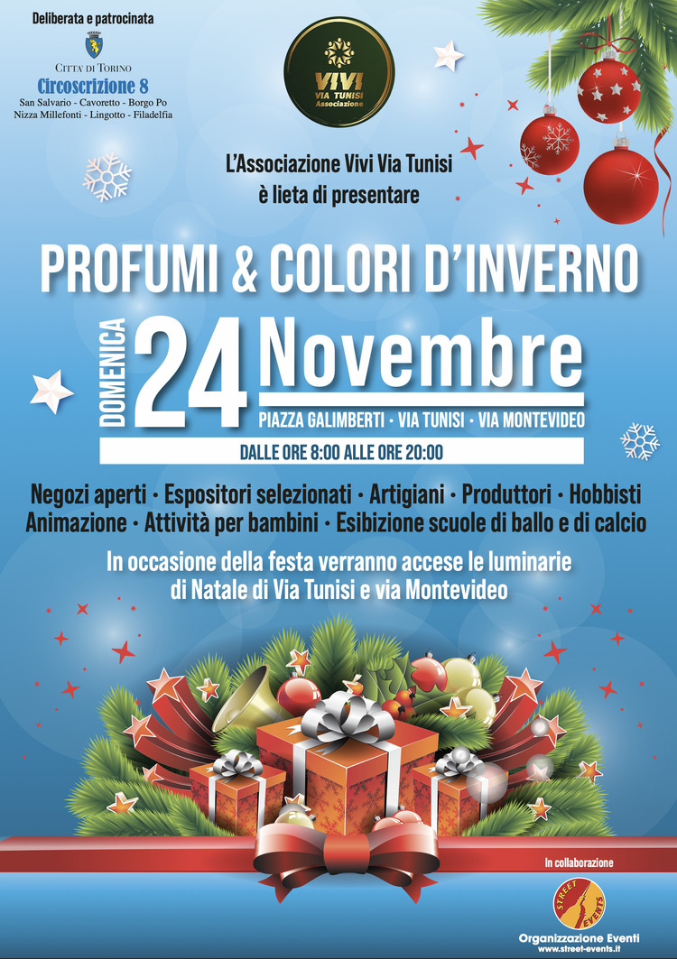 La festa di via "Profumi e Colori d'Inverno", patrocinata dalla Circoscrizione 8 della Cittą di Torino e organizzata dall' Associazione Vivi Via Tunisi, celebra l'arrivo delle festivitą natalizie con un programma ricco di attivitą.